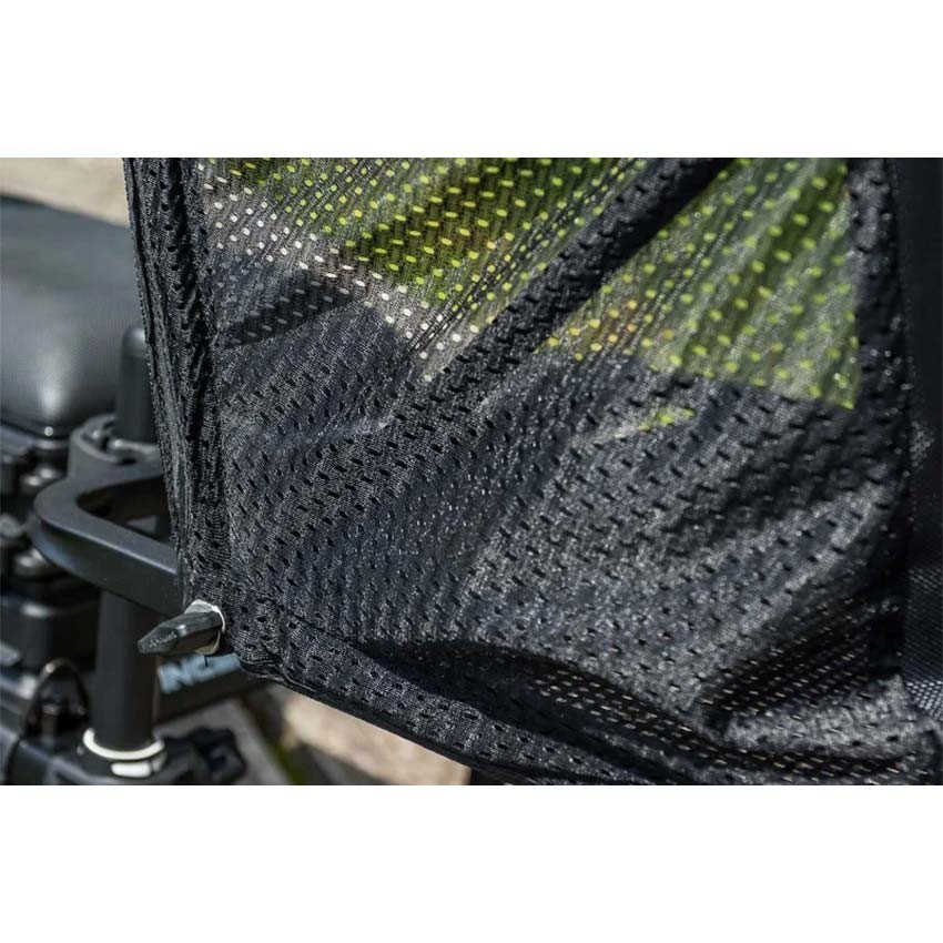 Капакът се фиксира стабилно с два ръчни винта, разположени отстрани на масата, което осигурява сигурност и лесно регулиране по време на риболов. Конструкцията тип Venta-Lite е лека, но здрава, и предлага добра вентилация, като същевременно защитава съдържанието.
