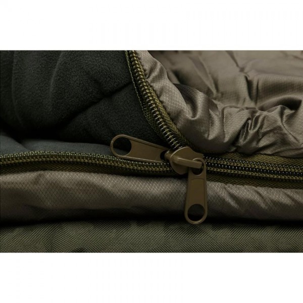 Външната част е изработена от дишащ, водоотблъскващ Ripstop плат, а стратегически разположеният пълнеж оптимизира топлоизолацията и комфорта през три сезона. Вътрешността е изцяло подплатена с ултра мек и гладък полиестер, подходящ за риболовци, които предпочитат да спят облечени. В зоните на главата и брадичката е добавена микро флийс подплата за допълнителен уют.