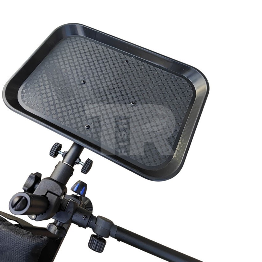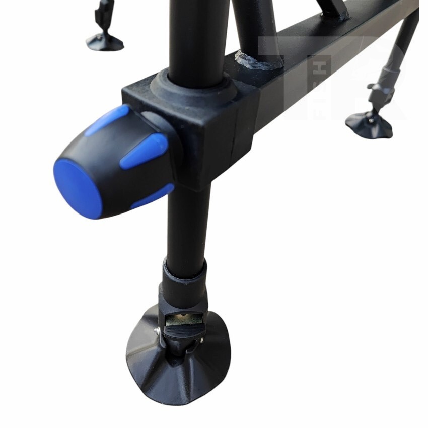 Столът е оборудван с четири регулируеми крака, които осигуряват стабилна позиция дори на неравен терен. В комплекта са включени странична тава, телескопично фидер рамо и държач, които улесняват подреждането на въдицата, стръвта и аксесоарите по време на риболов.