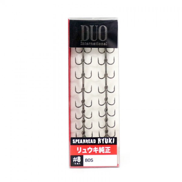 DUO International Spearhead Ryuki Treble Hook са оригинални тройни куки, разработени като фабрично решение и като висококачествен заместител за воблерите от серията DUO Realis Ryuki и други примамки на марката. Моделът комбинира тънка, но изключително здрава тел с нано покритие, което осигурява отлична острота и надеждност без да нарушава баланса и играта на примамката.