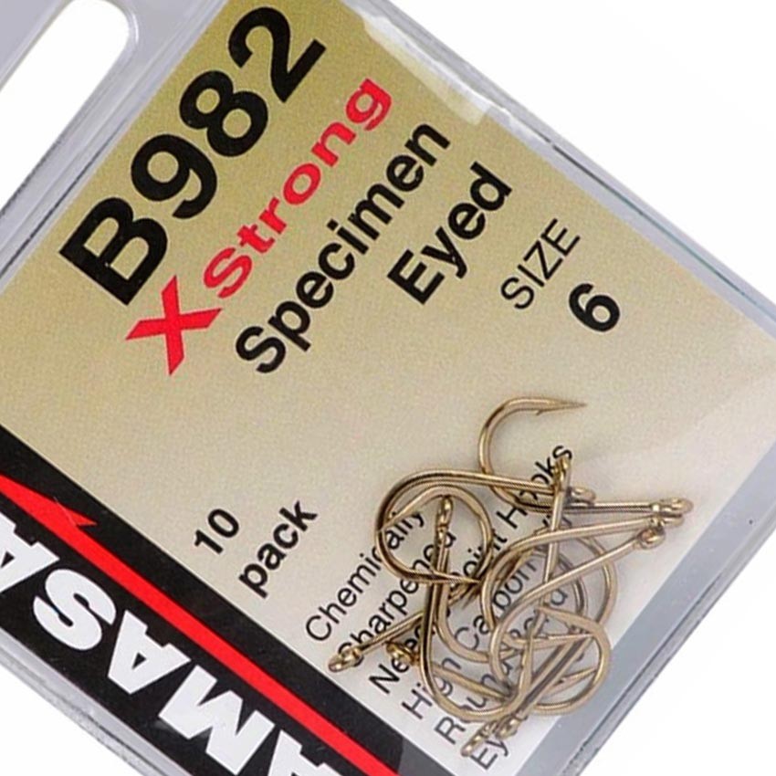 KAMASAN B982 X-Strong Specimen Eyed са изключително здрави единични куки, създадени специално за риболов на едри и силни риби. Моделът е със средно дълго стъбло и изработен от груба, високоякостна тел, което осигурява максимална устойчивост при тежки натоварвания.
