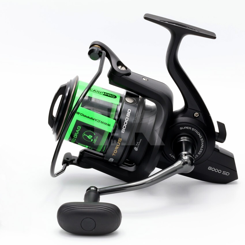 Carp Pro Torus 8000 SD е макара, създадена да се справя с големи дистанции и тежки монтажи. С предавателно число 4.5/1 и обиране 100см при оборот, тя дава баланса между сила и техника, необходим в шаранския стил риболов.