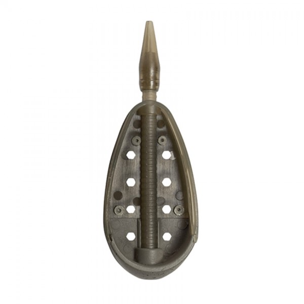 Частично затворената конструкция предпазва захранката при замятане и при контакт с водата, като осигурява по-добро задържане и по-прецизна презентация около хранилката.