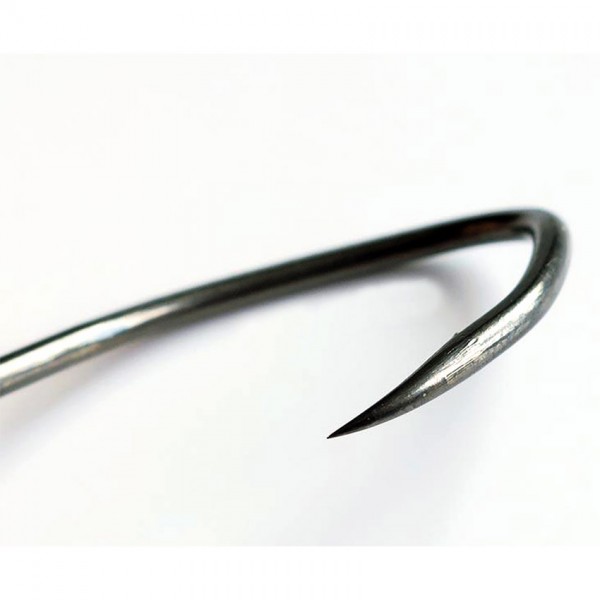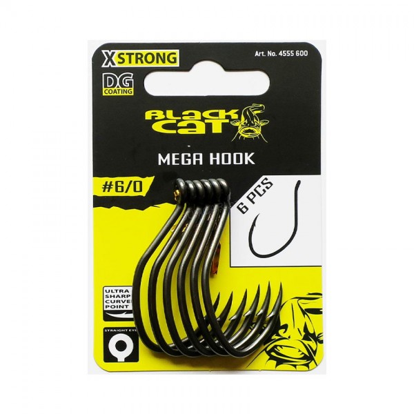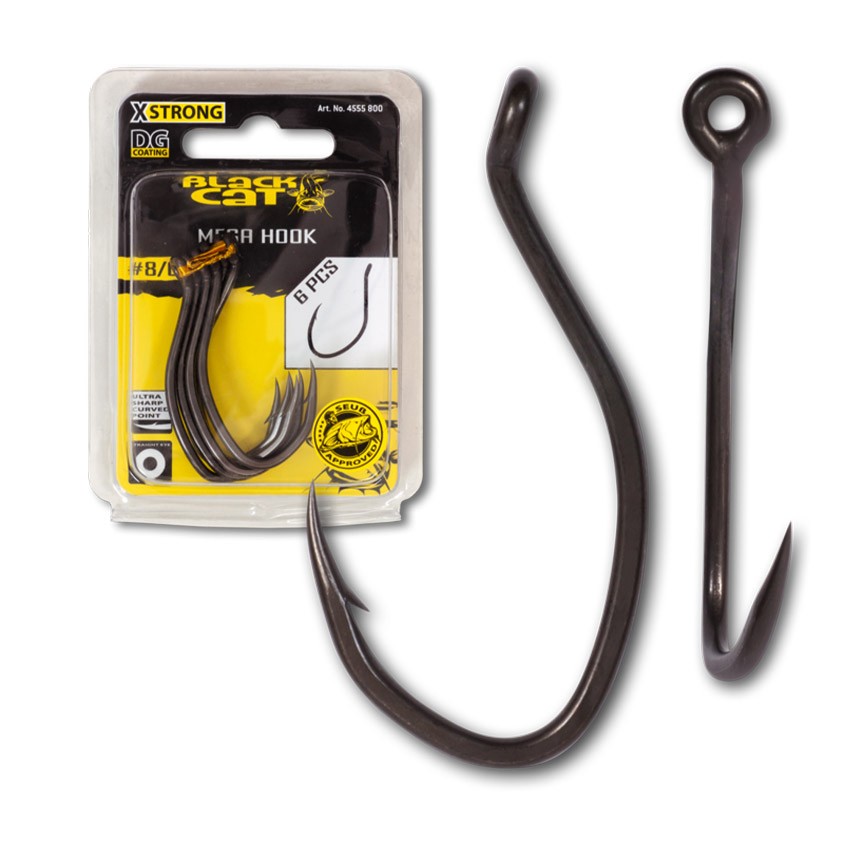BLACK CAT Mega Hook DG е универсалната единична сомска кука, която покрива почти всички сценарии. Уникалната форма с извит, удължен и изключително остър връх осигурява бързо и сигурно самозасичане – както при deadbait, така и при multi-hook монтажи за жива стръв. Когато търсиш една единствена кука, на която да разчиташ, това е тя.