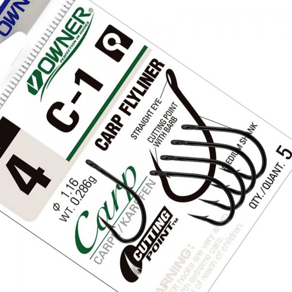 OWNER Carp Flyliner C-1 са класически японски куки, разработени за шарански риболов с дънни монтажи, където се търси баланс между надеждна засечка, стабилност и контрол при борбата с рибата. Моделът е резултат от дългогодишните инженерни разработки на OWNER в областта на високоякостните шарански куки.