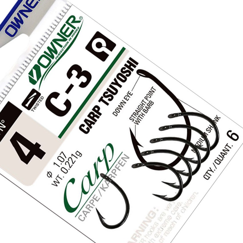 OWNER Carp Tsuyoshi C-3 са специализирани японски куки, разработени за шарански риболов при сериозно натоварване. Моделът е създаден с фокус върху здравина, надеждна засечка и стабилно задържане на рибата по време на борба.