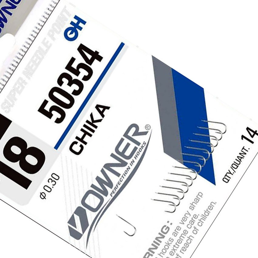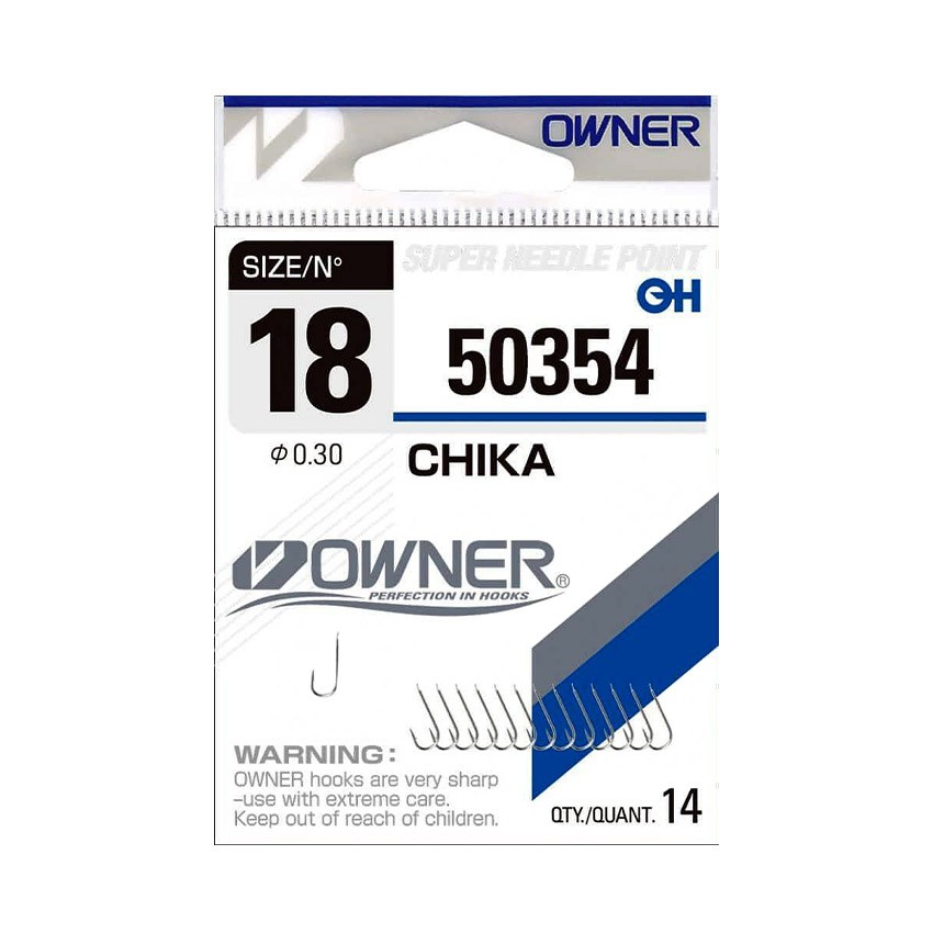 OWNER Chika White 50354 са японски куки за плувка с лопатка (spade end), предназначени за прецизен риболов с естествена стръв. Моделът е с правилна форма и средно дълга дръжка, което го прави универсален при различни презентации и поводи.