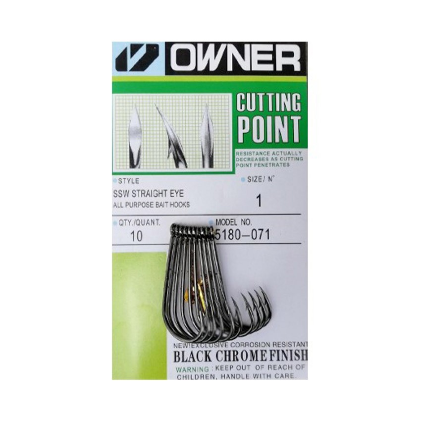OWNER Cutting Point 5180 са висококачествени японски куки с ухо, специално разработени за риболов с жива стръв. Моделът разполага с двойна контра на стеблото, която фиксира стръвта стабилно и предотвратява приплъзване при силно замятане или активна игра на примамката.