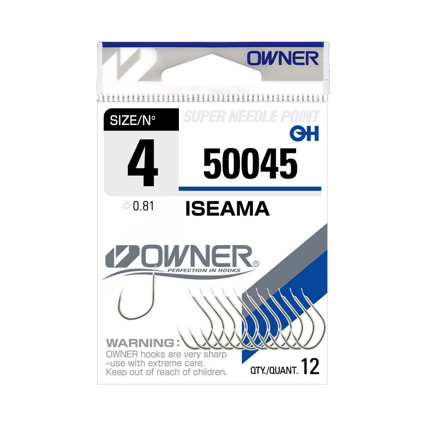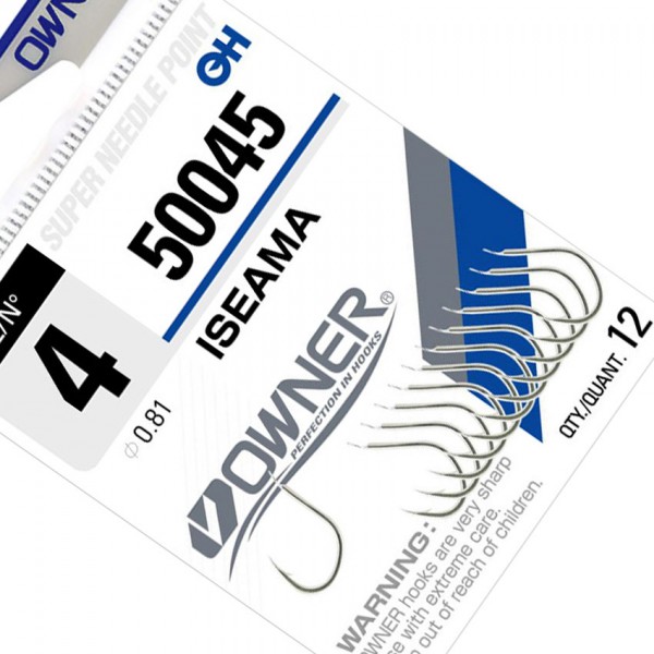 OWNER Iseama White са здрави японски куки за тежък риболов на едри и борбени мирни риби, идентични по форма и конструкция с модела Iseama Gold, но с бяло никелово покритие. Куката е кована, с дебело тяло и странично извито острие, което осигурява отлична устойчивост и сигурно задържане при сериозно натоварване.