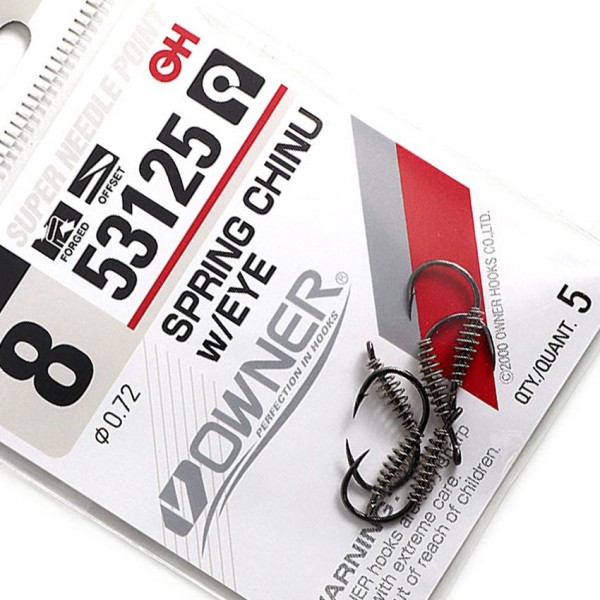 OWNER Spring Chinu w/Eye 53125 са висок клас японски куки с ухо, разработени специално за риболов с мека стръв. Моделът се отличава с право стебло, обла извивка и леко завит навътре връх, което осигурява сигурно самозасичане и стабилен захват.