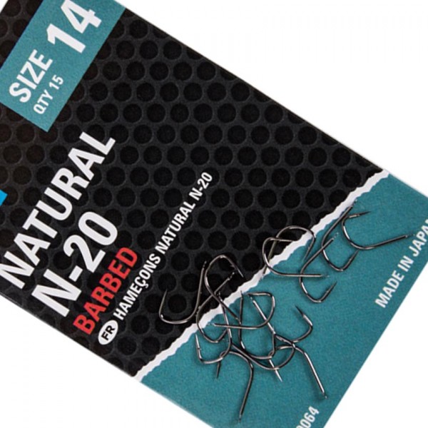 PRESTON Natural N-20 са високоефективни куки, разработени специално за активен фидер риболов, когато целта е бързо темпо и максимален брой уловени риби. Моделът се отличава с широка извивка (wide gape) и прав връх, което осигурява сигурно закачане и отлична реализация при интензивен риболов.