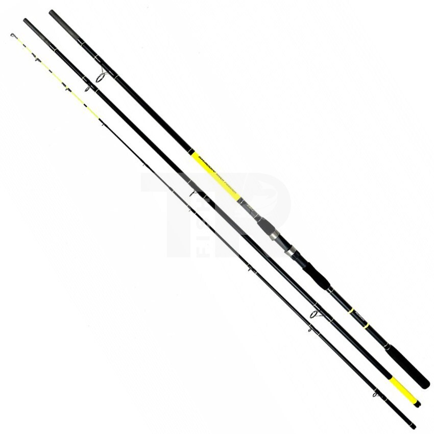 Моделът идва с три плътни карбонови върха с висока акция – 5.0 oz, 6.5 oz и 8.0 oz, всеки оцветен в ярко жълто за максимална видимост. Тези върхове осигуряват отлична индикация, но запазват нужната твърдост за работа с тежки хранилки в бързи води.
