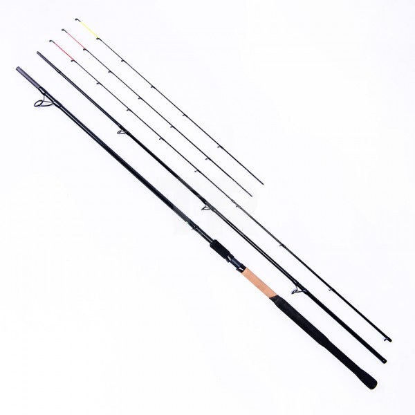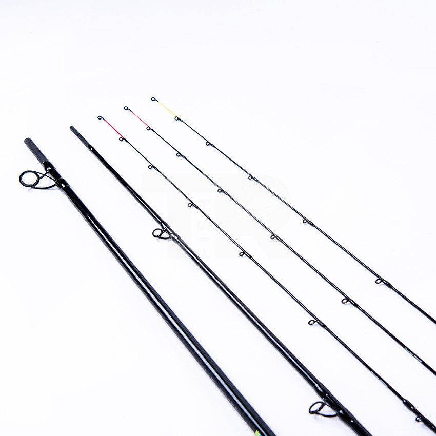 В комплектa са включени три карбонови върха с различни акции, което позволява адаптиране към различни условия и чувствителност според използваната хранилка.