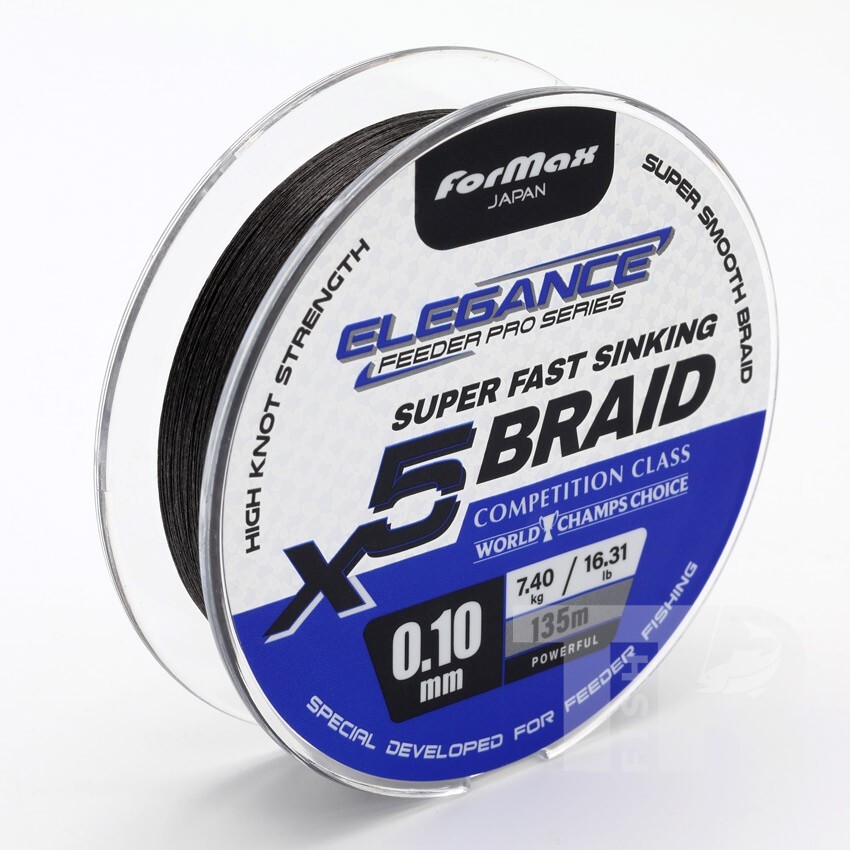 FORMAX Elegance Fast Sinking Braid x5 е плетено мултинишково влакно, изплетено от пет PE нишки, проектирано да потъва бързо (super fast sinking) — идеално за фидер риболов при условия, в които монтажът трябва да потъне бързо към дъното.
